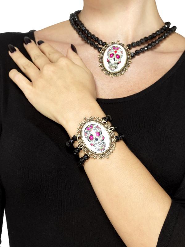 Day of the Dead Beaded Bracelet, Black, on Display Card