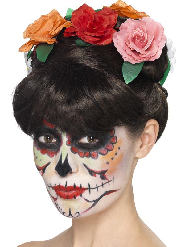Day of the Dead Frida Wig, Black, with Plaits & Flowers, in Display Box