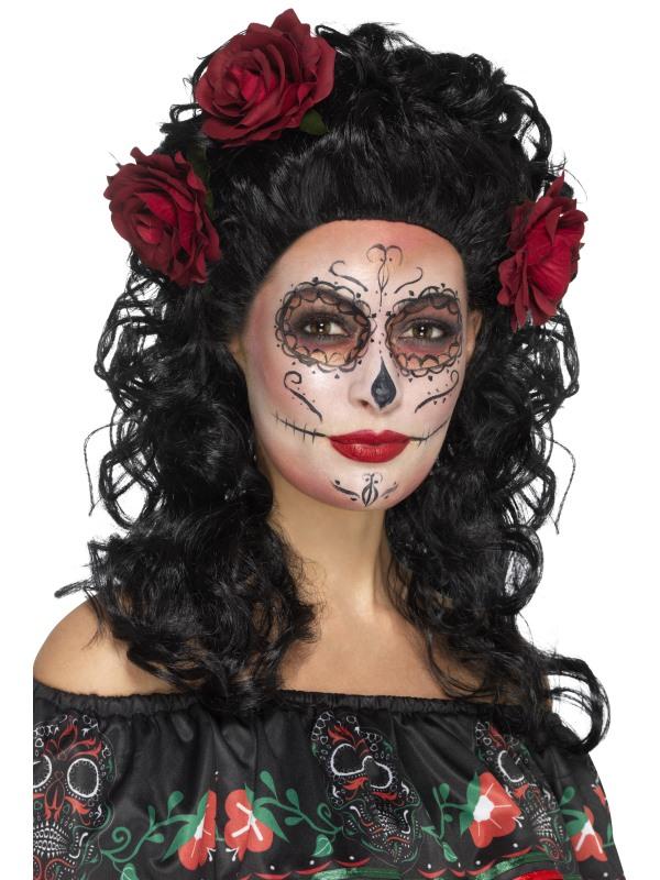 Deluxe Day of the Dead Wig, Black, with Roses, in Display Box