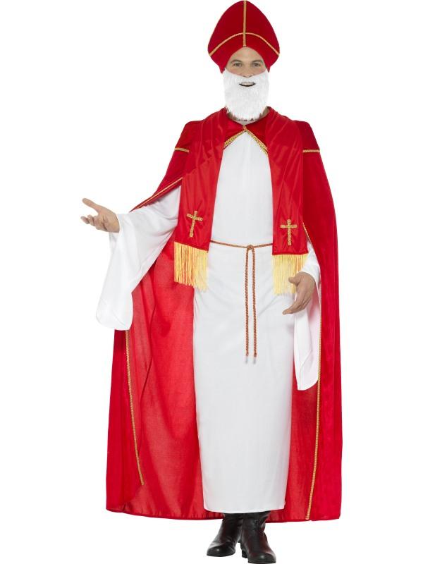 Deluxe Saint Nicholas Costume, Red & White, with Hat, Beard, Robe, Cloak, Scarf & Belt, in Display Bag